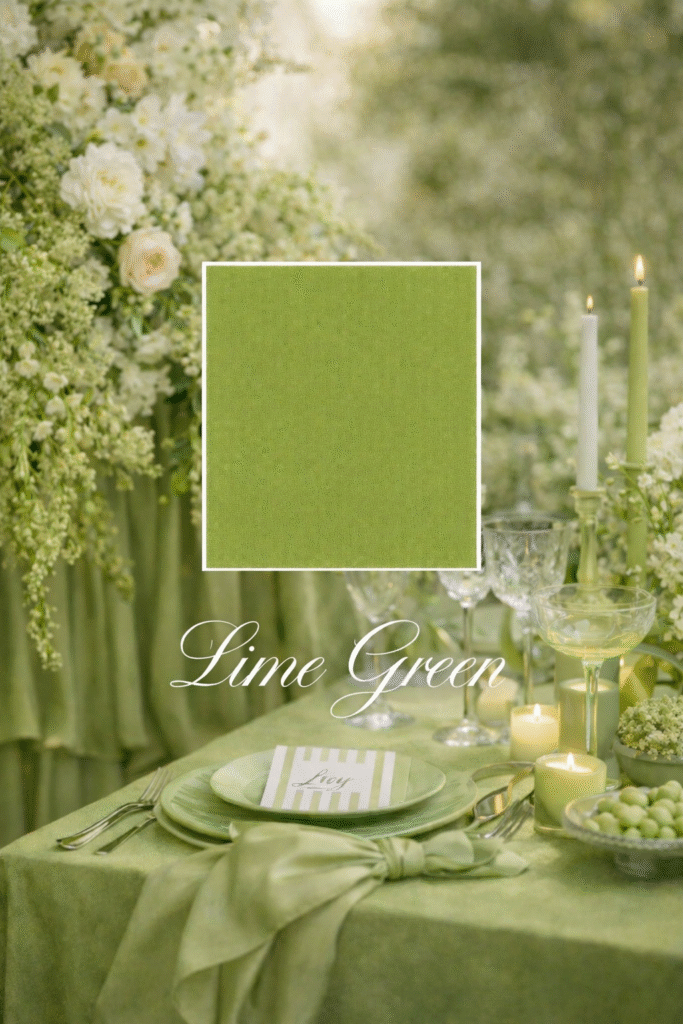 Fresh and vibrant, Lime Green brings a sense of renewal and modern energy to wedding design. Inspired by nature, this shade is ideal for daytime celebrations, garden settings, and contemporary concepts. When paired with soft florals and natural textures, Lime Green feels light, refined, and joyful.