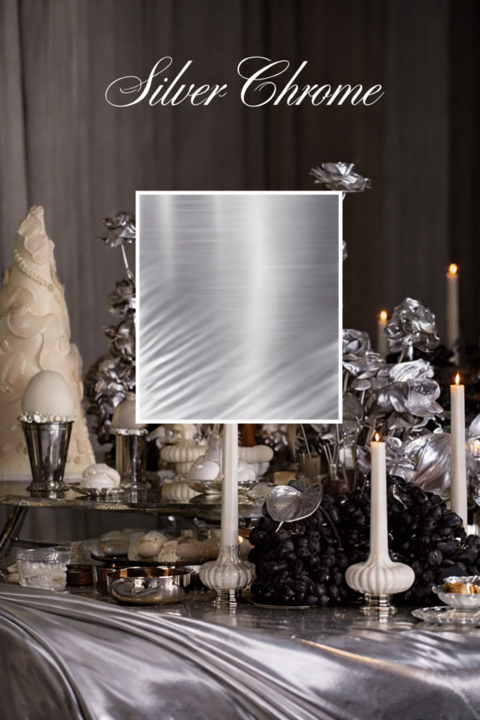 Silver Chrome introduces a contemporary and artistic edge to wedding styling. Reflective surfaces, metallic details, and sculptural elements create a striking visual experience. This color is perfect for modern venues and evening receptions where design takes center stage and elegance meets innovation.