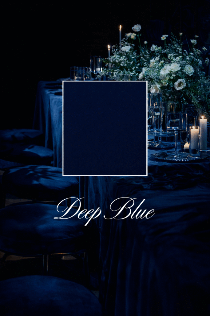 Deep Blue evokes serenity, confidence, and sophistication. It creates an intimate and refined atmosphere through rich textiles, candlelight, and balanced contrasts. A timeless choice for luxury venues and evening weddings, Deep Blue speaks to couples drawn to quiet elegance and depth.