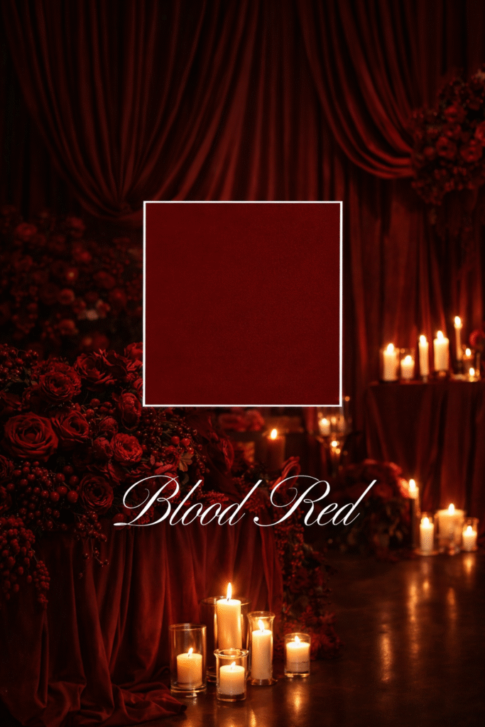 Bold and intense, Blood Red represents passion and strength. This color creates immersive wedding settings through rich fabrics, dramatic lighting, and deep floral compositions. Perfect for evening celebrations and statement venues, Blood Red is chosen by couples who want their wedding to leave a powerful emotional impression.